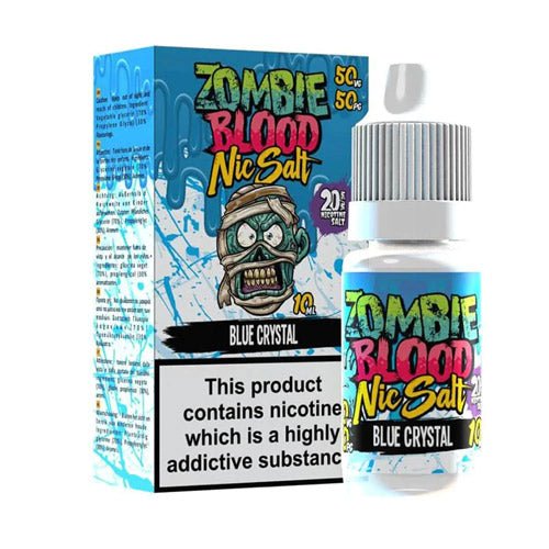 Blue Crystal 10ml Nic salt Eliquid by Zombie Blood You can expect major flavours from this Blue Crystal vape, double the Blueberries and double the Menthol for that wow hit time and time again. On inhale Blueberry flavour and exhale Menthol flavour.