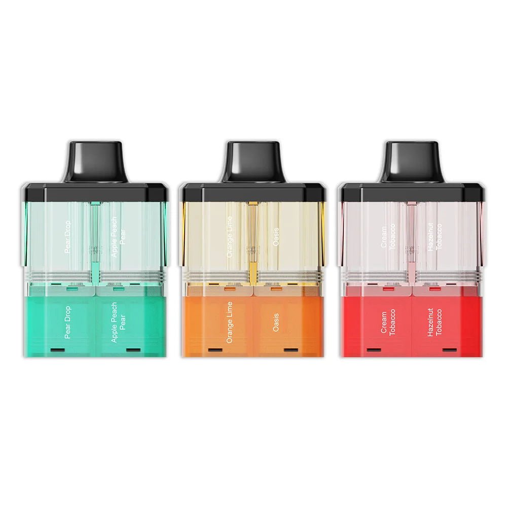 Banana Ice / Pineapple Ice, Berry Lemonade / Blueberry Bubblegum, Black Mamba / Blue Fusion, Blueberry Raspberry / Blueberry Sour Raspberry, Blue Razz Cherry / Blue Razz Lemonade, Blue Razz Gummy / White Gummy, Bubblegum Ice / Ice Pop, Cherry Cola / Fizzy Cola, Cherry Lime / Cola Lime, Cherry Sour Raspberry / Blueberry Cherry Cranberry, Cola Ice / Bull Ice, Cream Tobacco / Hazelnut Tobacco, Double Mint / Double Menthol, Fizzy Cherry / Cherry Ice, Fizzy Vim2 / Grape Berry, Hubba Bubba / Watermelon Ice, Juicy Peach / Fizzy Guava, Kiwi Passionfruit Guava / Passionfruit Raspberry, Lemon Lime / Lemon Peach Passionfruit, Mango Banana / Strawberry Banana, Mango Peach Pineapple / Triple Mango, Mr Blue / Mad Blue, Mr Pink / Pink Lemonade, Orange Lime / Oasis, Pear Drop / Apple Peach Pear, Rainbow / Gummy Bear, Strawberry Kiwi / Strawberry Raspberry Ice, Strawberry Raspberry Cherry Ice / Strawberry Raspberry Blueberry, Strawberry Raspberry Lemon / Blue Raspberry Lemon, Strawberry Watermelon Bubblegum / Strawberry Raspberry Bubblegum, Summer Dream / Sakura Grape