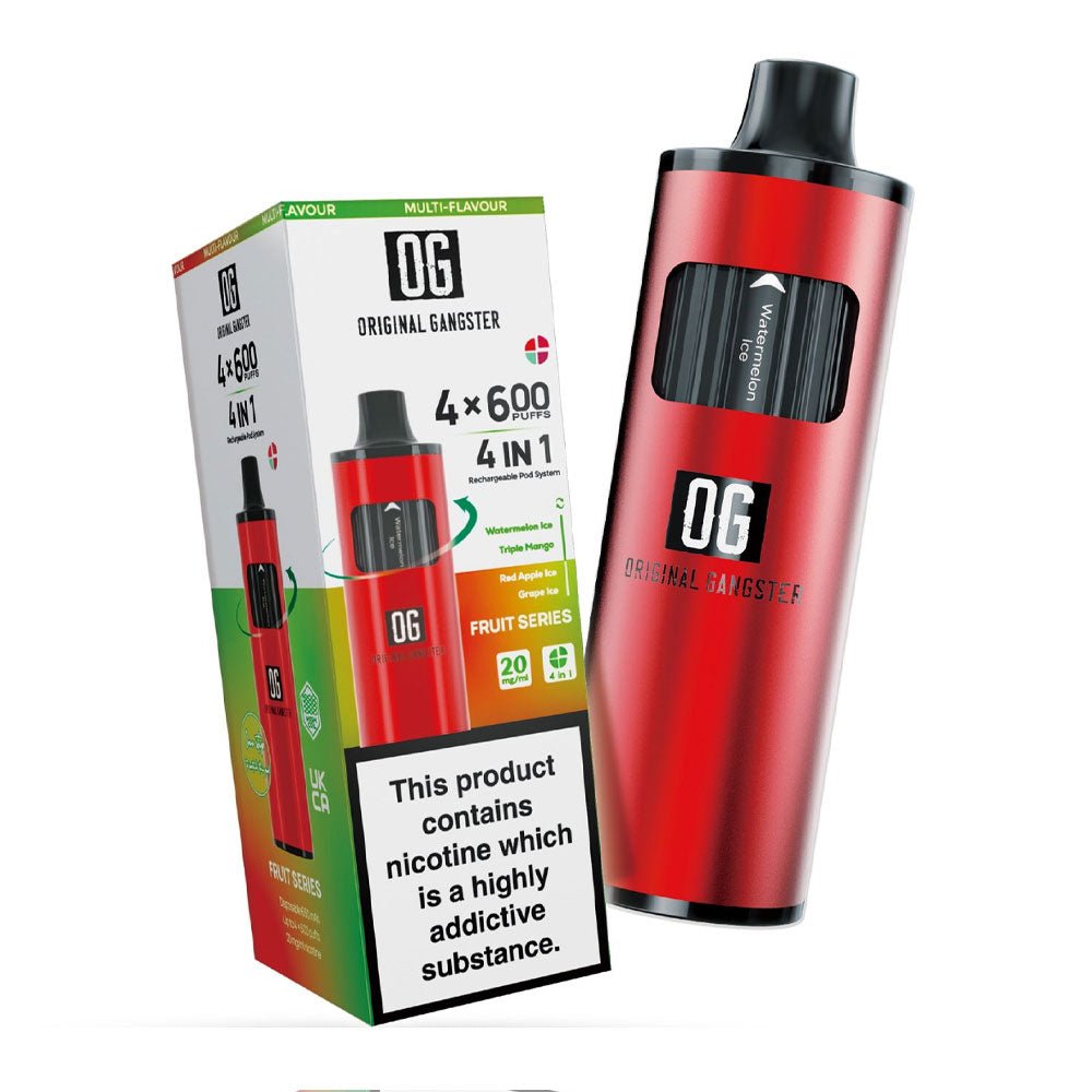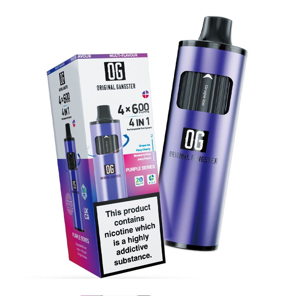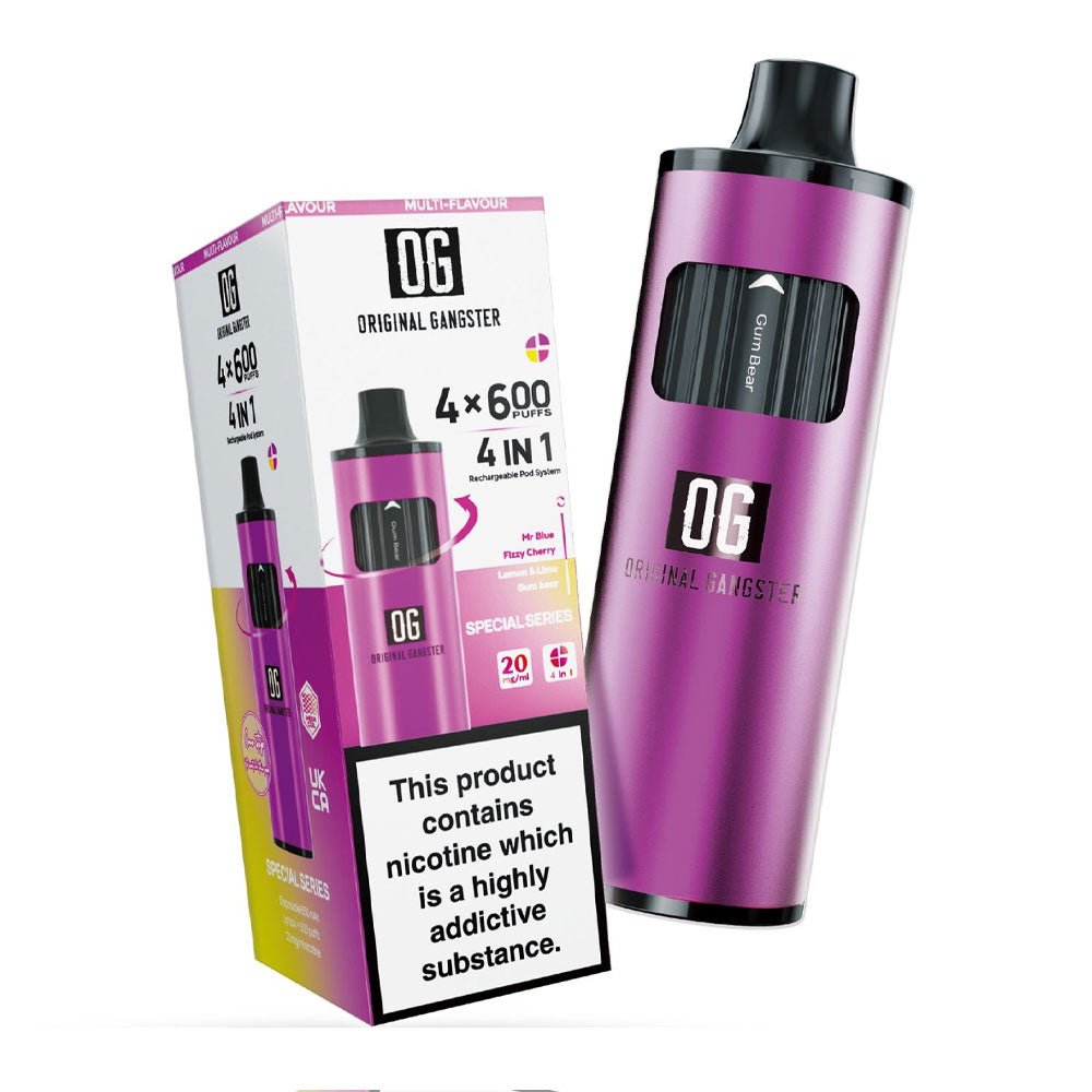 Original Gangster OG 2400 4-in-1 Disposable Vape offers 2400 puffs with four different flavours. The device is rechargeable and offers uninterrupted vaping.